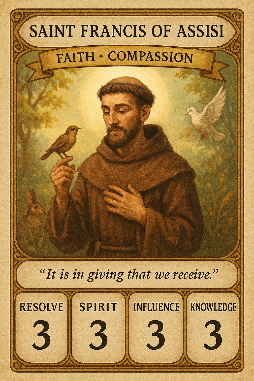 Each Saint card is a historical figure, defined by their key Domains, four core stats, a special ability reflecting their life, and an inspiring quote.